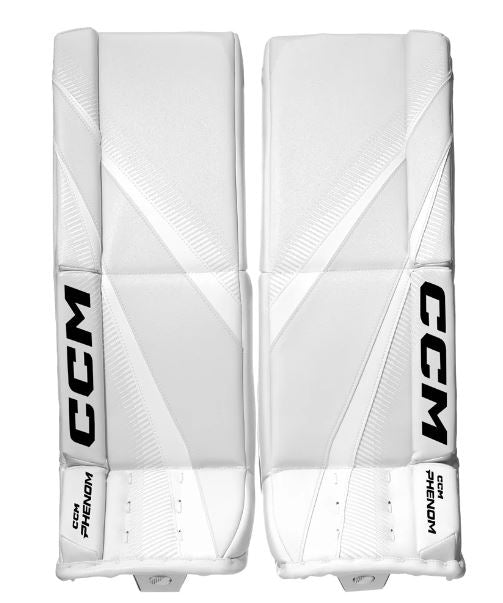 The CCM PHENOM junior goalie pads are designed for young goaltenders looking for enhanced flexibility and control. These pads feature LITECORE™technology and provide a lightweight, balanced design for quick reactions and easy pad rotation. The DFLEX core construction helps goalies deflect pucks out of harm's way, while the single inner and outer break offers added curvature above the knee for excellent five-hole coverage. The ADPTFIT strapping system makes for an easy personalized fit that provides a secure feel and easy butterfly rotation. The contoured shape and textured landing zone of the quick stack knee help goalies move with ease and provide extra balance when moving along the ice from one save to the next.