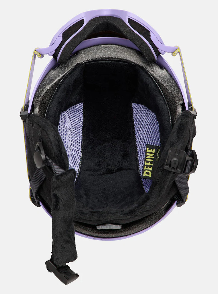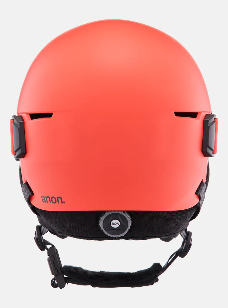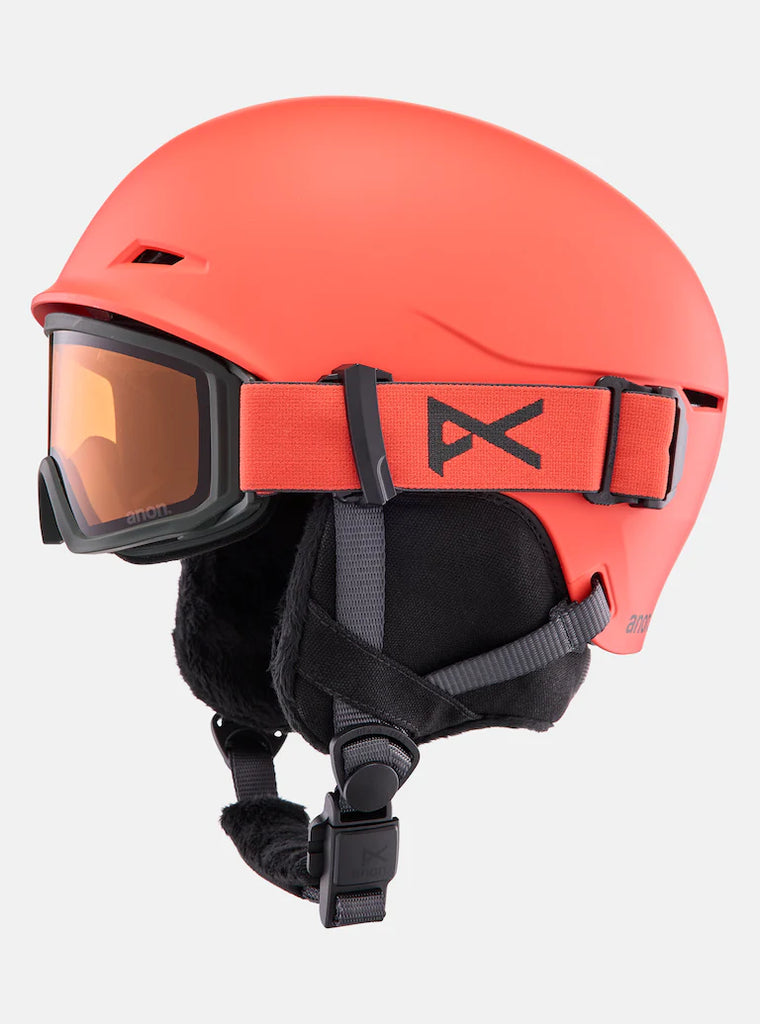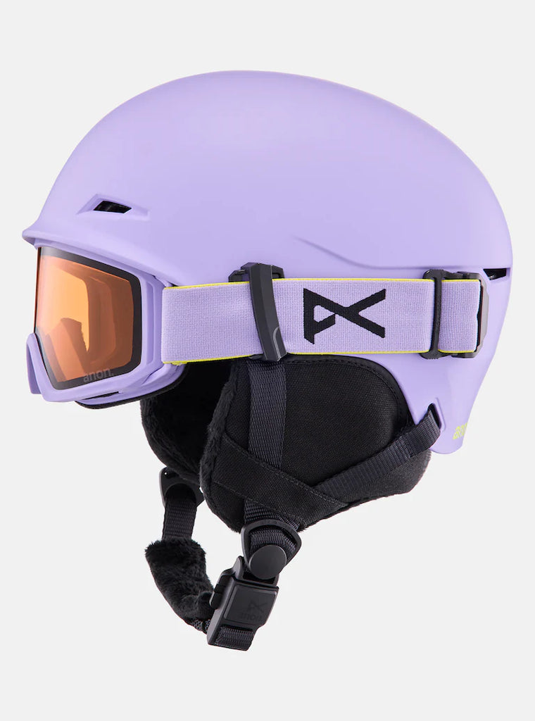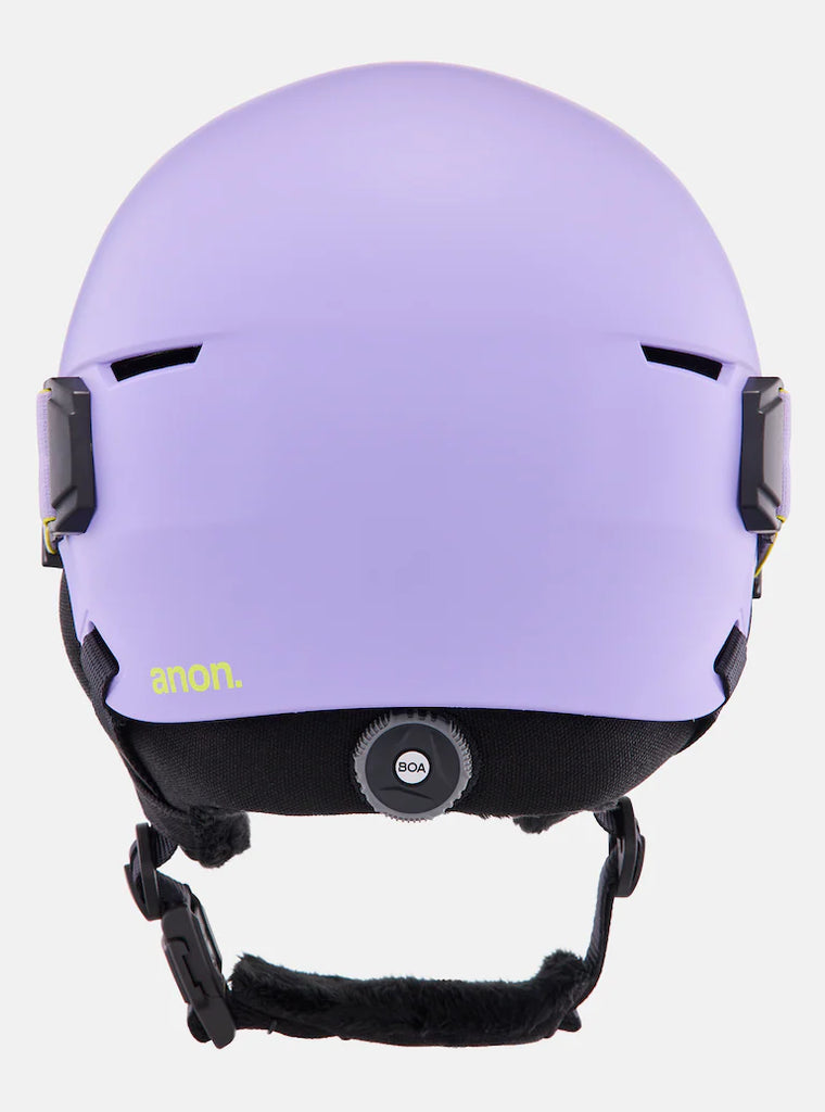 The kids' Anon Define Helmet simplifies the experience for kids and parents alike by integrating goggles into the helmet so nothing falls off or gets lost. The kid-proof design includes a hardshell exterior for everyday durability. A 180° BOA® Fit System offers quick, micro-adjustable fit with the turn of a dial, and fixed vents keep the air moving for fog-free goggles and all-day comfort. Our strapper-keeper technology incorporates the goggle right into the helmet for a perfect fit around small faces. Includes a protective microfleece tote bag for storage and transport.