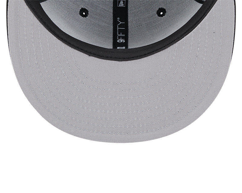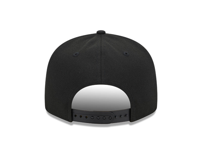 This NFL 9FIFTY Snapback features an allover black fabrication with an embroidered team script logo at the front panels and an adjustable snapback closure at the rear.