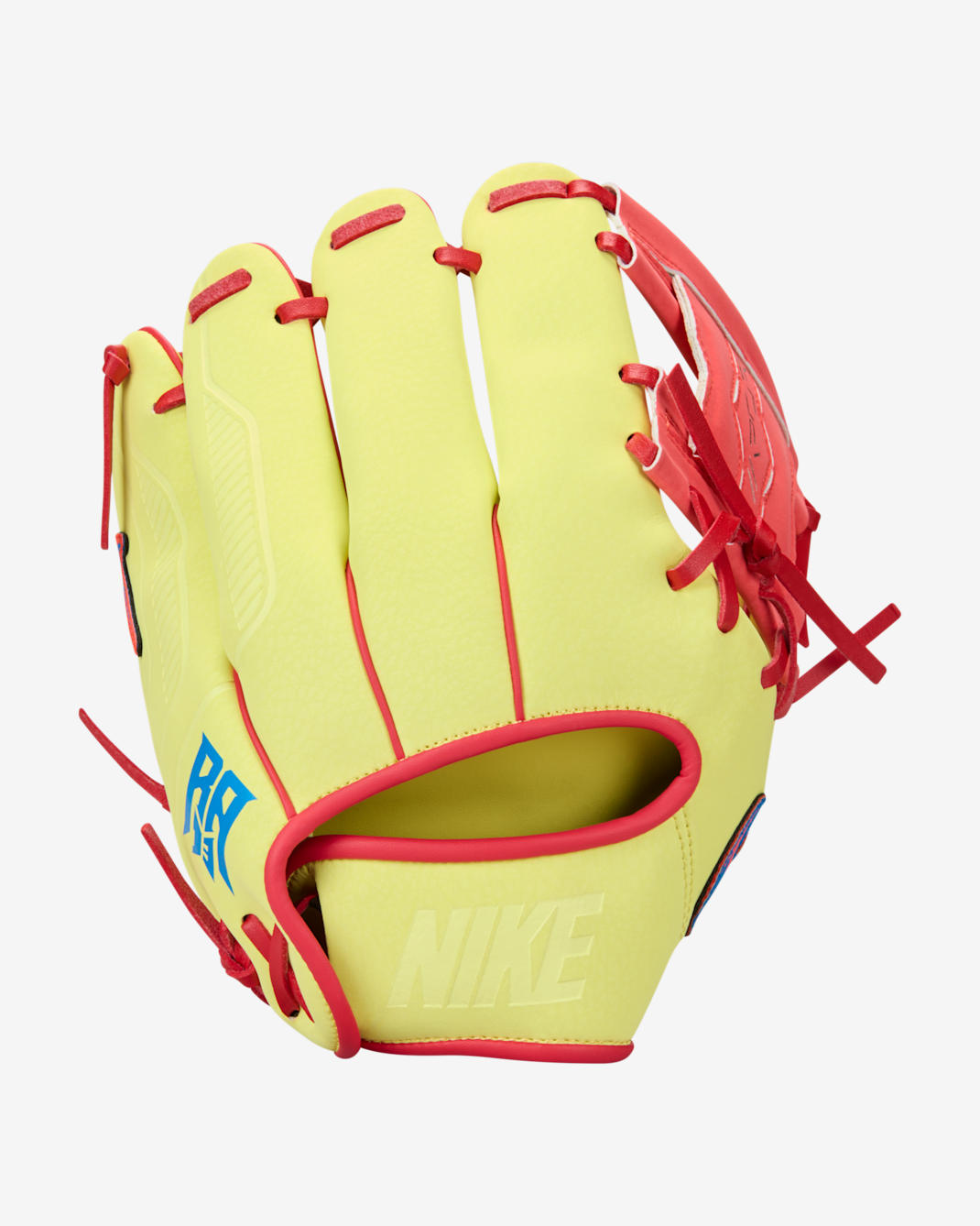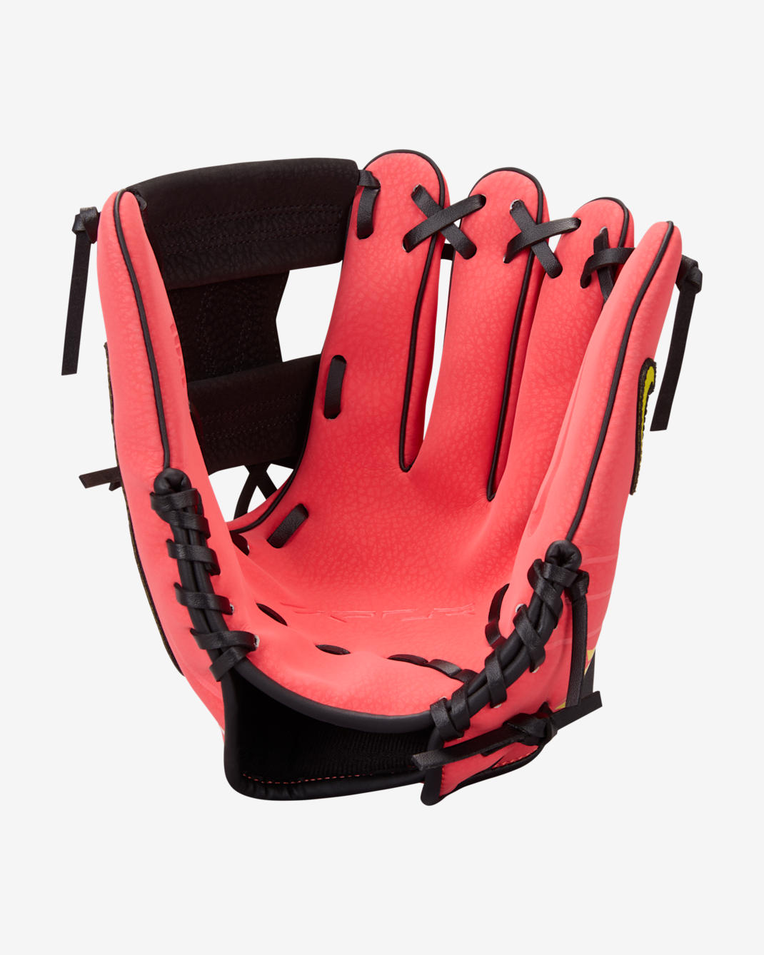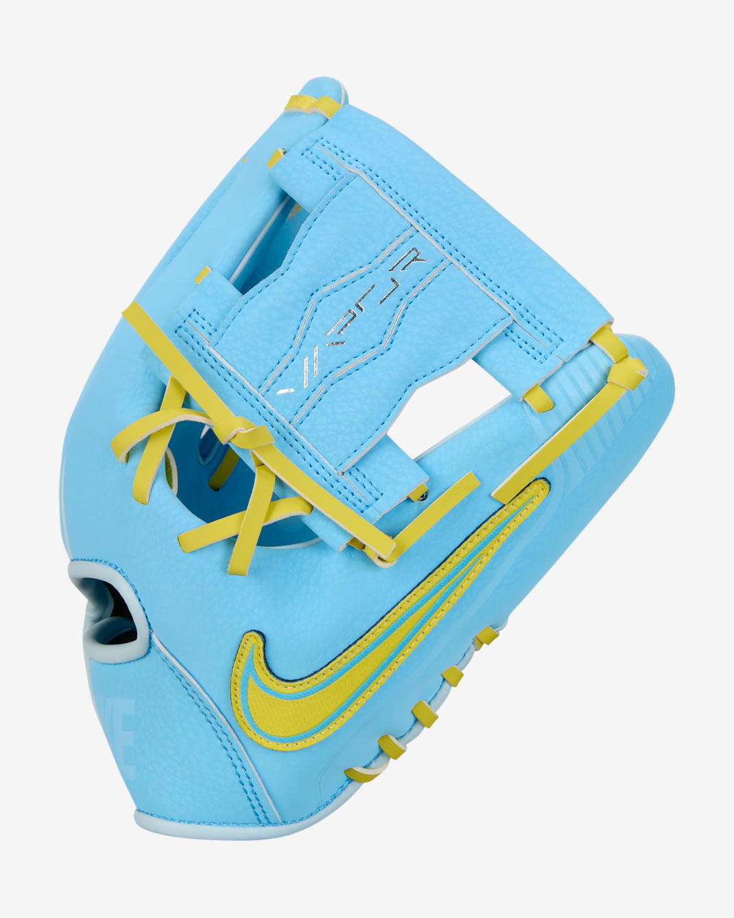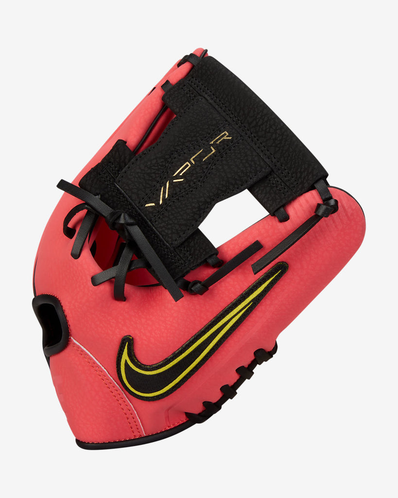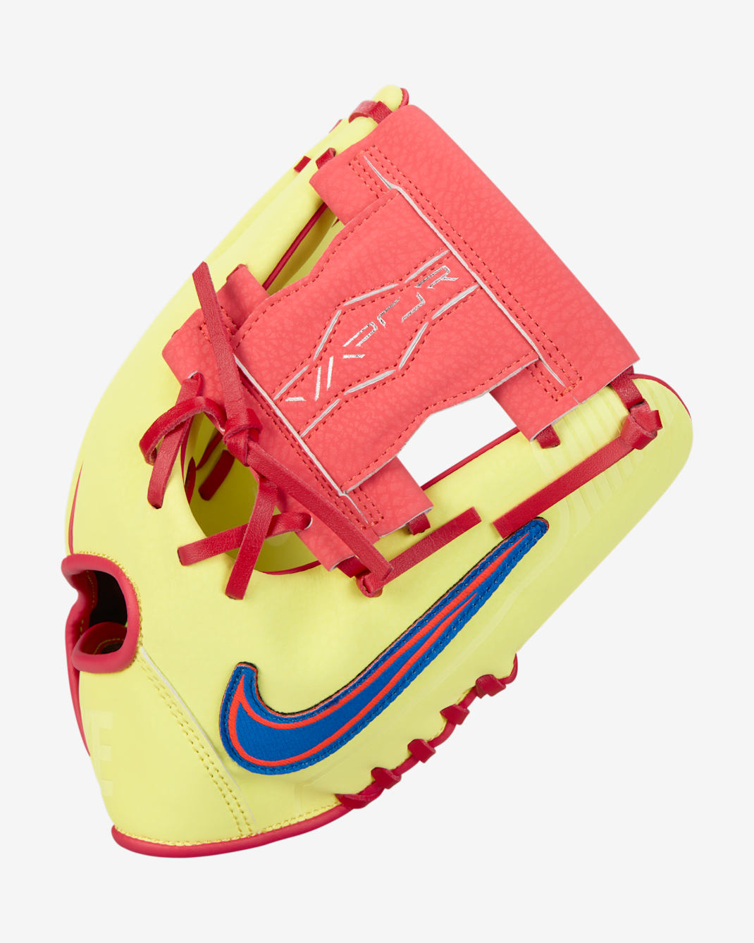 Grounded in baseball tradition, Nike Vapor is the result of state-of-the-art innovation and design excellence. Acuña’s signature version amps up the flash with colors inspired by his swagger and fearless, youthful energy, so you can make merciless plays in all-out style. It's designed with lightweight, synthetic material that's flexible for more give and natural hand movement, while flat welting on the fingers adds support and structure.