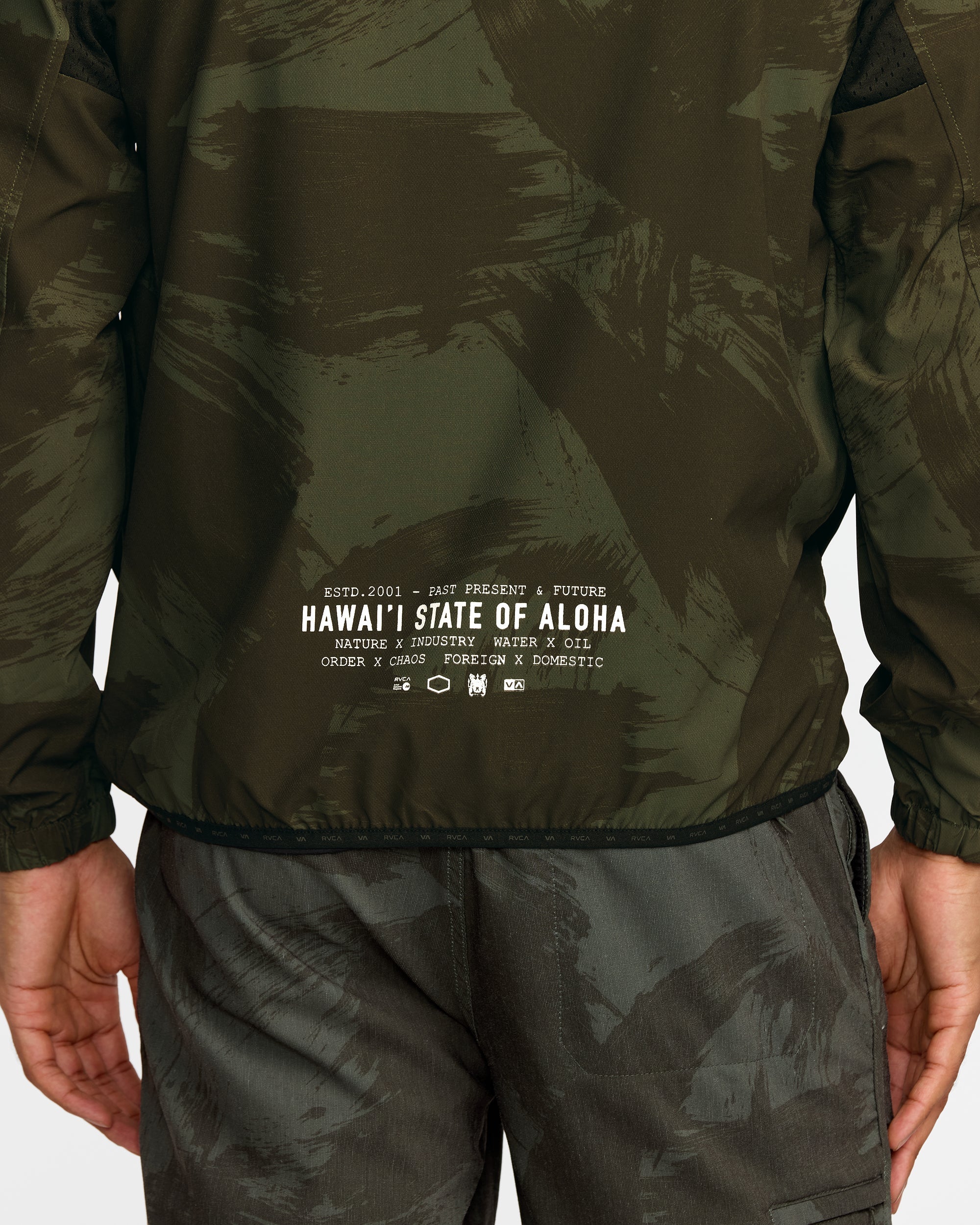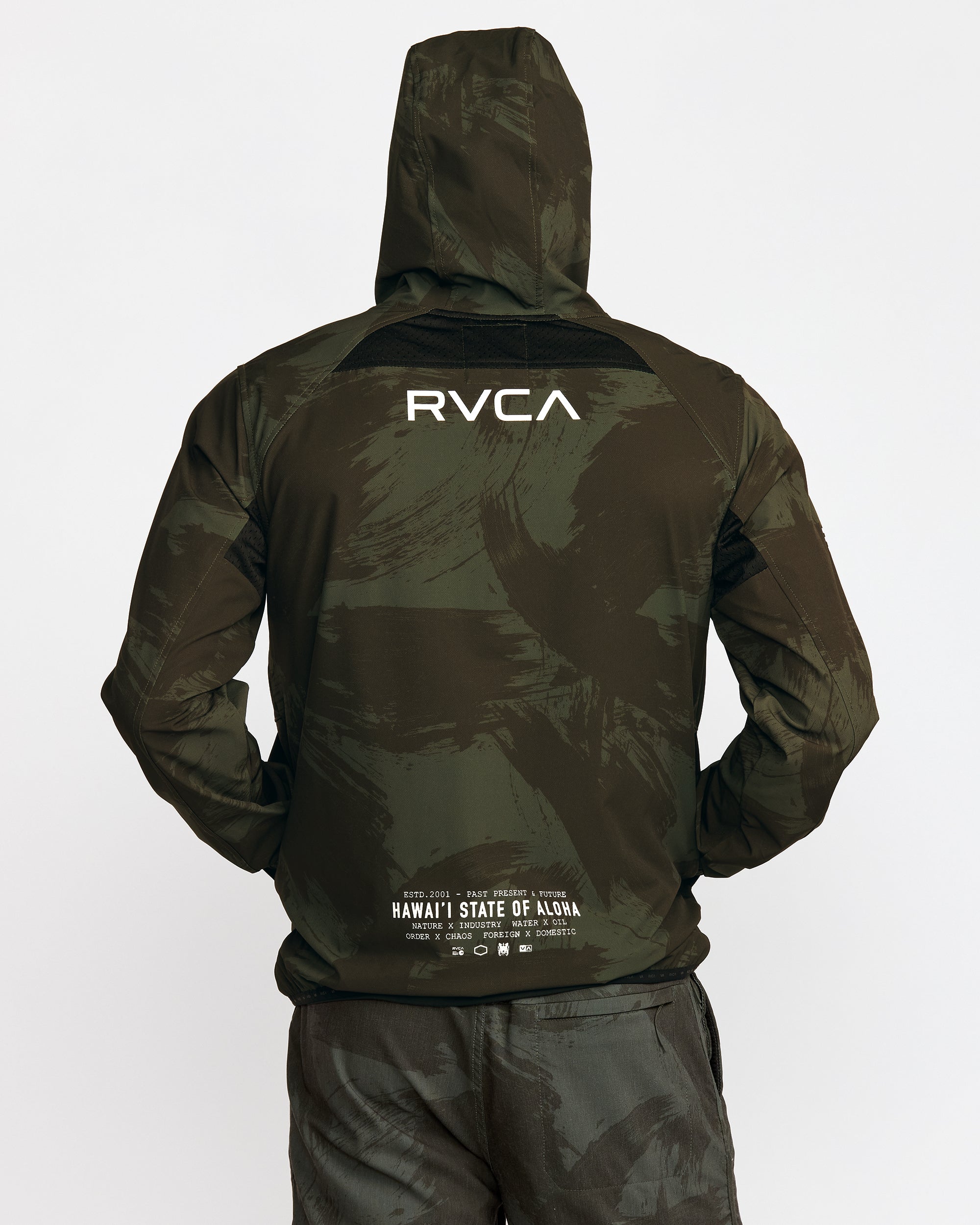The RVCA Hawaii full zip jacket protects from the elements with a water-repellent finish and adjustable hoodie while maintaining mobility in 4-way stretch fabric. Function and convenience is delivered with two welt pockets, zip closure, and bungee cord toggles for a customizable fit. Featured here in the dark khaki colorway.