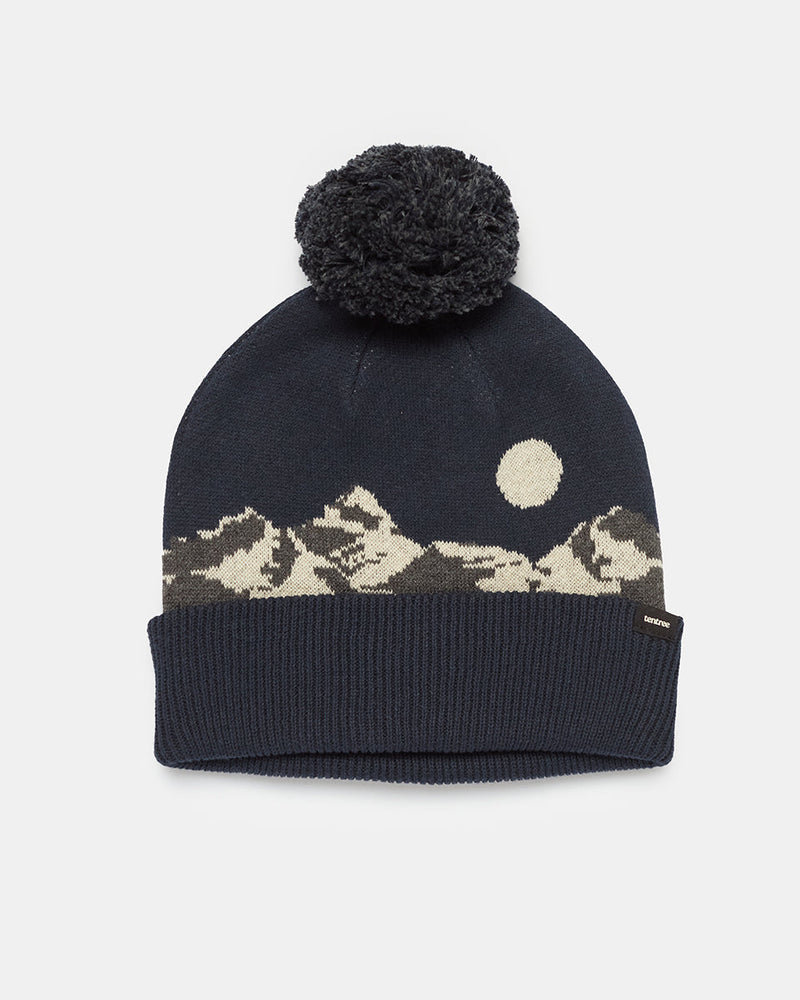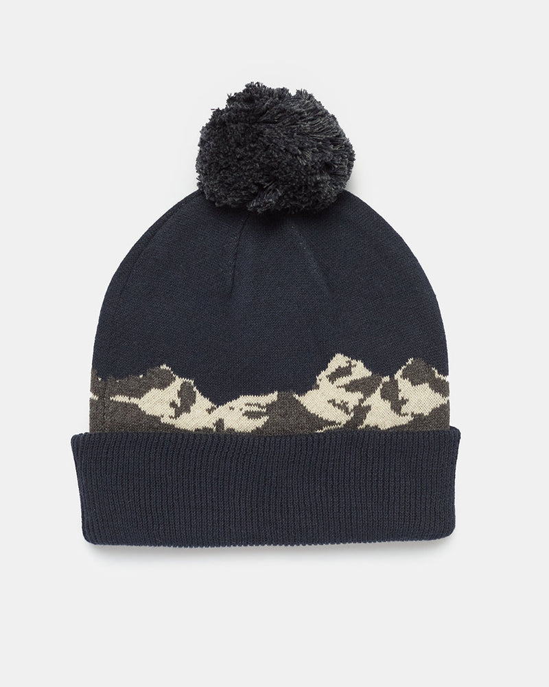 Turn up the cozy factor with this pom beanie. Made from organic cotton and adorned with a snowy mountain horizon, it's essential for those crisp cabin days.