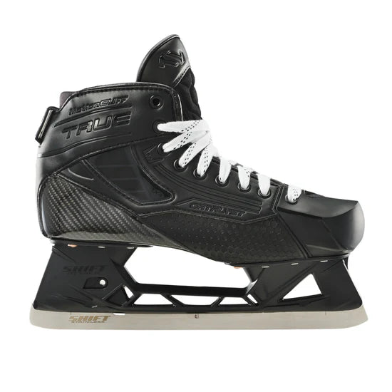 Introducing the True Catalyst 7X4 goalie skate, built for the goalie looking to take their game to the next level. Featuring True's patented NEUROFIT+ one-piece shell with the all-new Motion-Cuff technology, and Shift Attack holders, this skate offers elite performance at a lower price. This limited edition version features a fully blacked out exterior and holder.