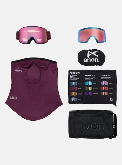 The Anon M6 Goggles offer a precise helmet-to-goggle fit with the wide field of view and low-profile design of a cylindrical lens. Our innovative Magna-Tech® quick lens-change technology uses powerful rare earth N52 magnets to make lens changes easier than ever. Perceive optics offer high-contrast, terrain-defining clarity. They feature our best anti-fog treatment for crystal-clear vision in a wide range of conditions. Full-perimeter venting plus moisture-wicking, ramped face foam creates a comfortable, form-fitting seal that supports fog-free clarity to anticipate every turn. Magnetic Face Mask Integration (MFI®) provides seamless face mask attachment. Includes a bonus Perceive lens so you're prepared for all conditions, plus an MFI face mask, microfiber goggle bag, and lens compression case.