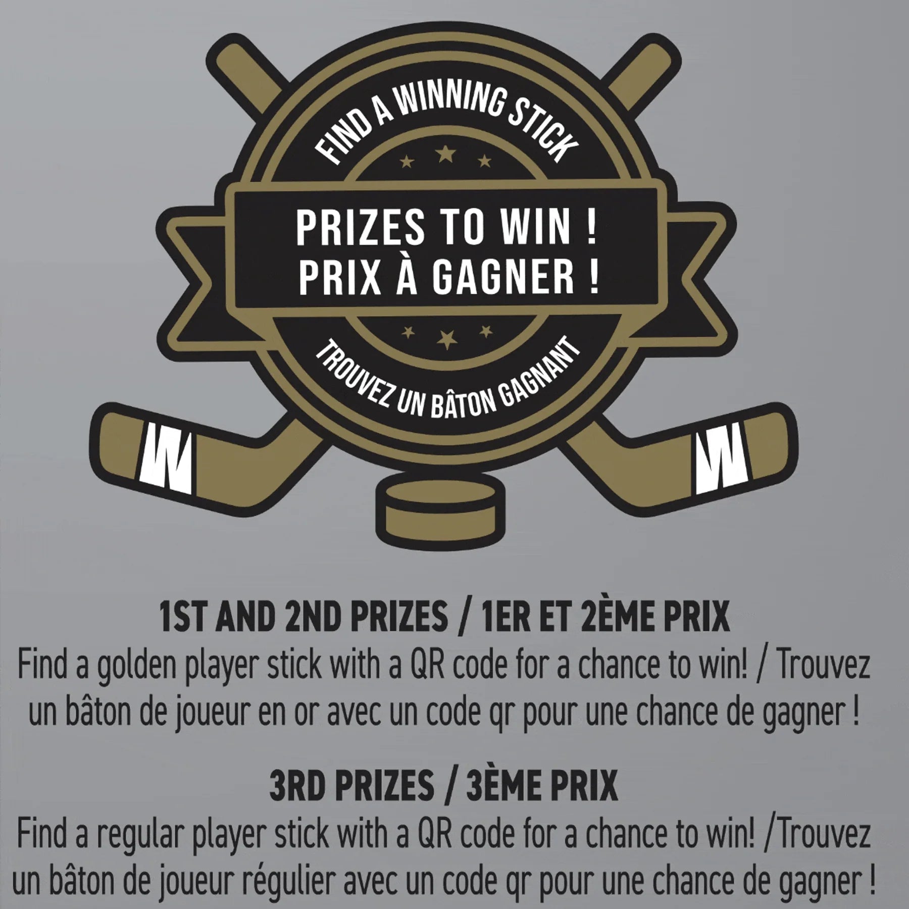 Find a standard Mystery Minis® stick within an eligible package with a winning prize code sticker on the blade for an opportunity to receive an autographed Mystery Minis® player stick.