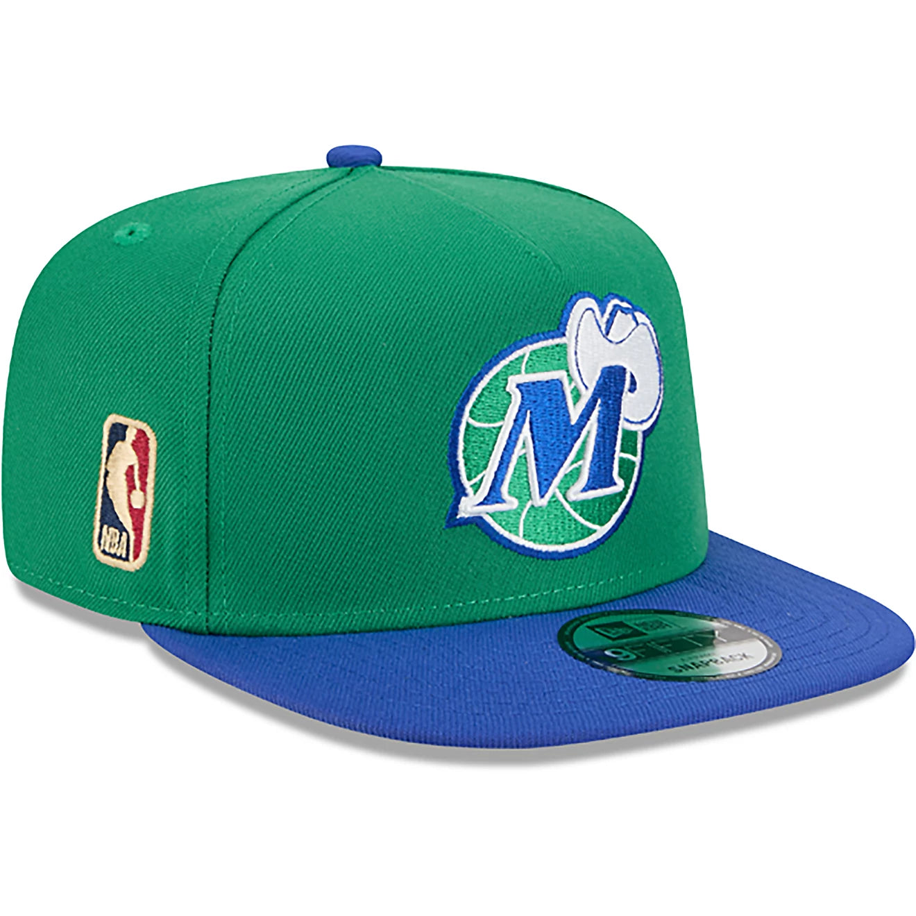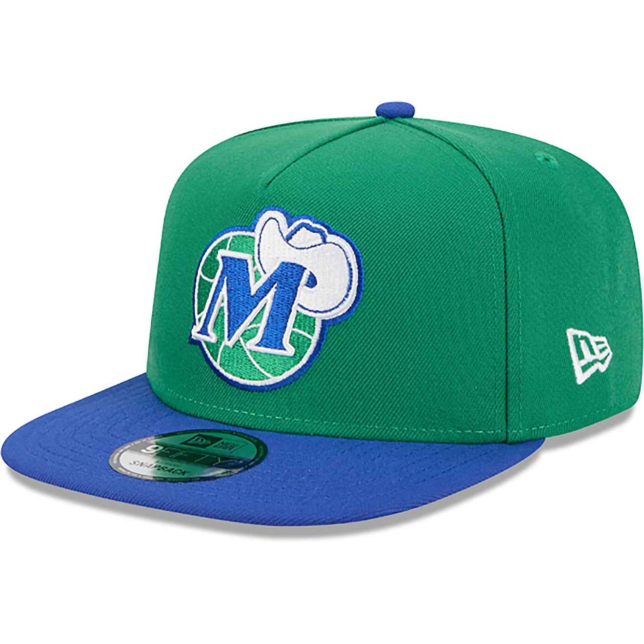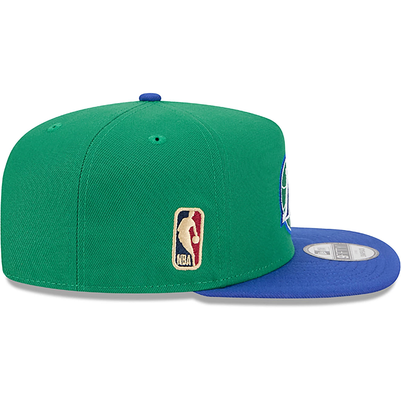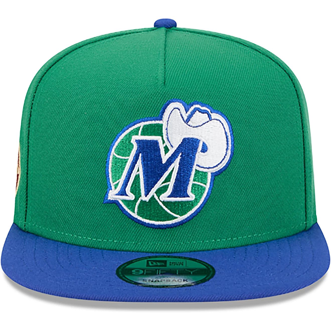 The Dallas Mavericks 2025 Classic Edition 9FIFTY A-Frame Snapback features an embroidered Mavericks logo at the front panel with a matching team wordmark above a snapback closure at the rear. Additional details include an NBA Logoman patch at the right-wear side with a gray undervisor.