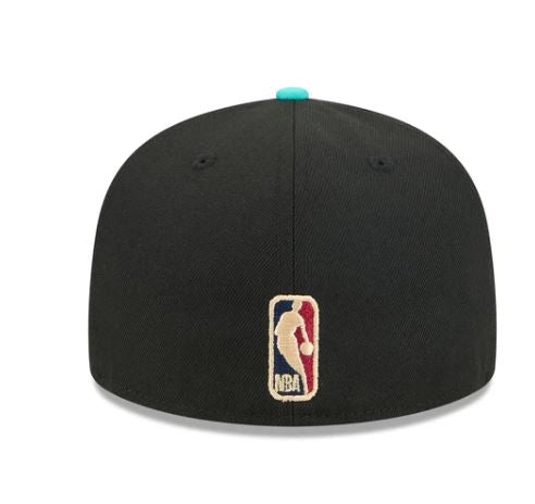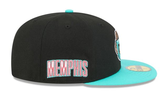The Memphis Grizzlies 2025 Classic Edition 59FIFTY Fitted Cap features an embroidered Grizzlies logo at the front panels with a matching team wordmark at the right-wear side, an NBA Logoman at the rear, and a gray undervisor.