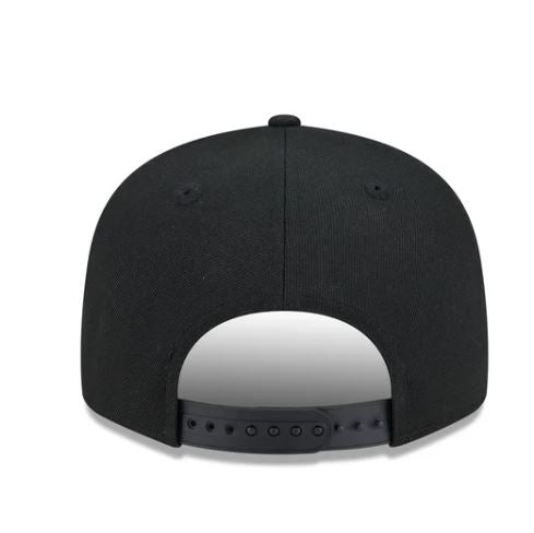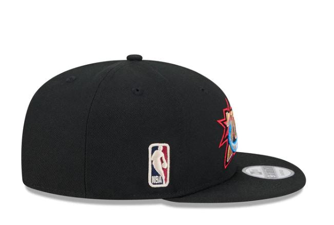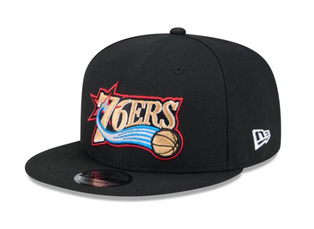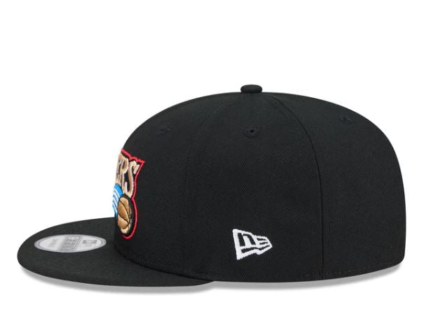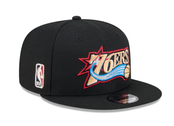 The Philadelphia 76ers 2025 Classic Edition 9FIFTY A-Frame Snapback features an embroidered 76ers logo at the front panel with a matching team wordmark above a snapback closure at the rear. Additional details include an NBA Logoman patch at the right-wear side with a gray undervisor.