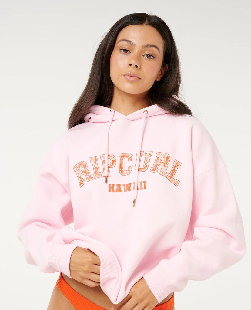 Varsity Desto Hoodie is cut from cotton-poly fleece 360G with a heritage fit and adjustable drawcord closure. Featuring front print, elastic cuffs, inner neck label, and woven flag label, it provides cozy warmth and surf-inspired style for casual layering.