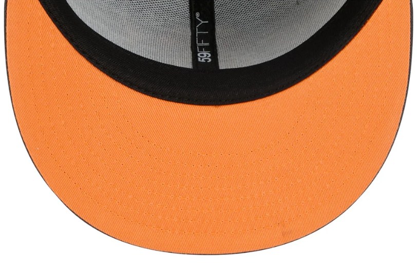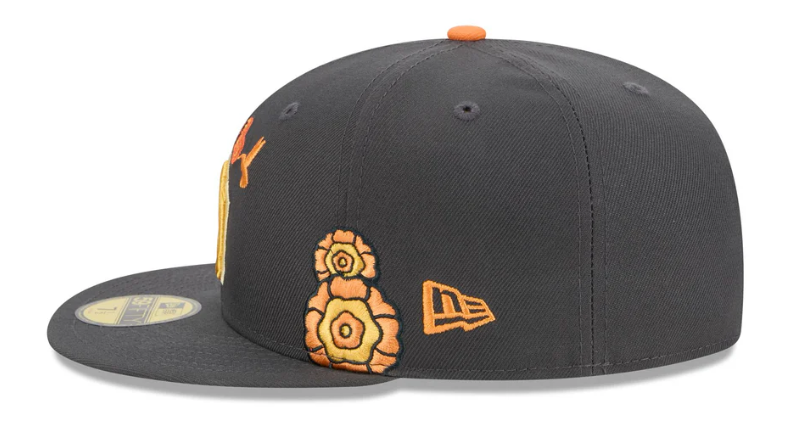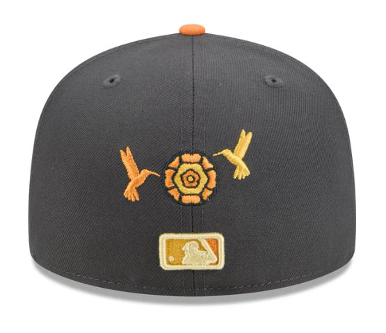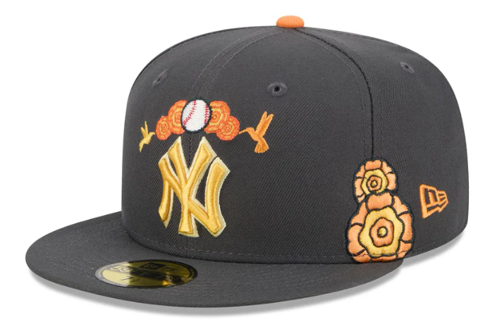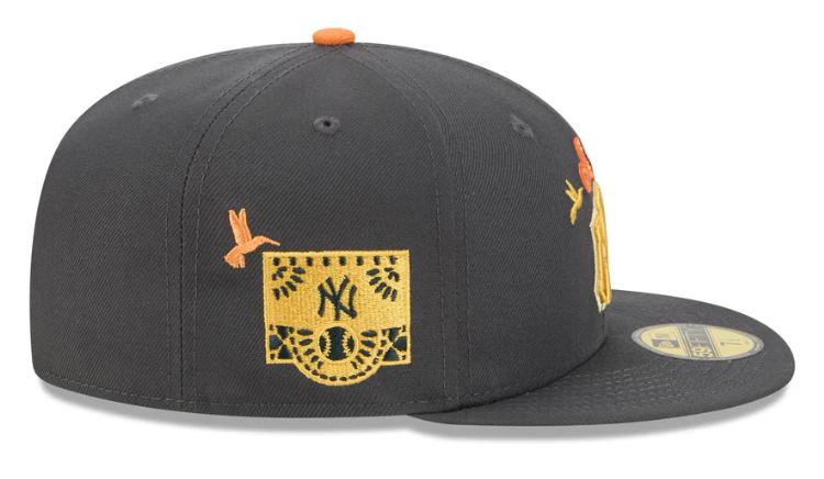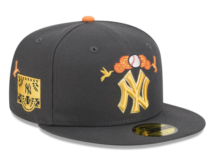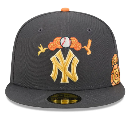 The New York Yankees Day of the Dead Graphite 59FIFTY Fitted Cap features an embroidered Yankees logo at the front panels with marigold (cempasúchil) and hummingbird designs throughout, representing the Legend of Xóchitl and Huitzilin. Additional details include a team patch at the right-wear side and a matching MLB Batterman logo at the rear.