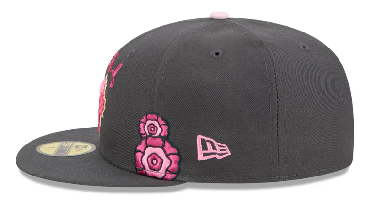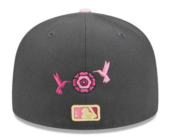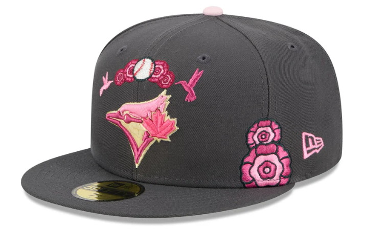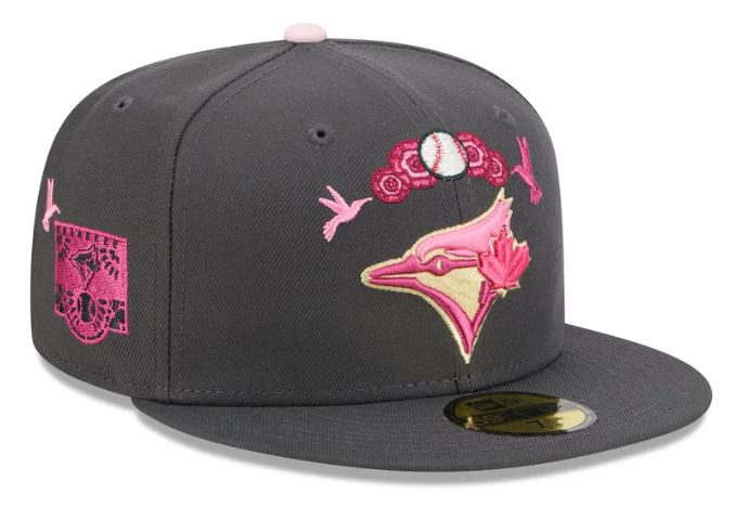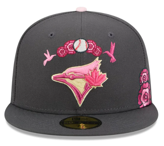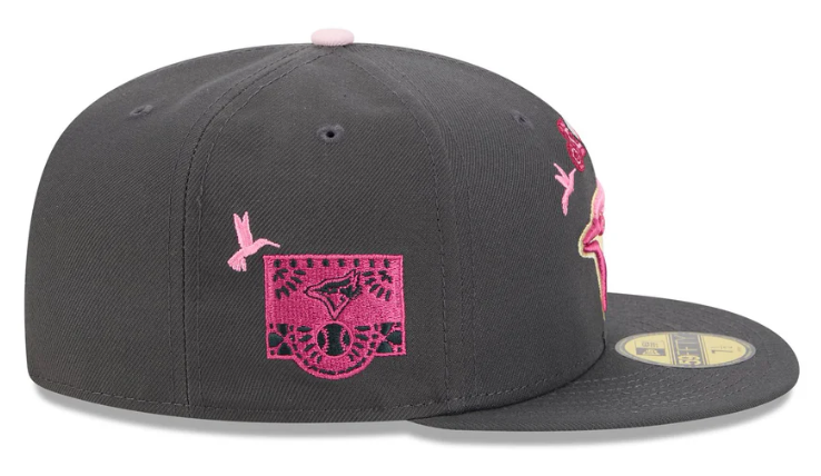 The Toronto Blue Jays Day of the Dead Graphite 59FIFTY Fitted Cap features an embroidered Blue Jays logo at the front panels with marigold (cempasúchil) and hummingbird designs throughout, representing the Legend of Xóchitl and Huitzilin. Additional details include a team patch at the right-wear side and a matching MLB Batterman logo at the rear.