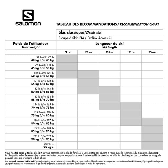Sporty yet classic, the Salomon Escape 6 Skin PM / Prolink Access CL adult waxless cross-country skis are designed for maximum stability and control. Their low heel-toe camber and their SkinGrip+ technology give it a secure, waxless grip. The skis are delivered with pre-mounted plates and with the safe Prolink Access bindings. Which size of skis to choose? The most important thing to think about is your weight. Then, you can fine-tune your choice based on your technical skill and your goals for making progress. Please refer to the Recommendation Chart to find the right ski length for you. In-store sales assistants can help you to make the right choice. You are stuck between 2 ski sizes? If you're just getting started with cross-country skiing or aren't comfortable with classic techniques yet, choose the smaller ski. However, if your goal is to improve your performance, it is recommended to go for the longer skis.