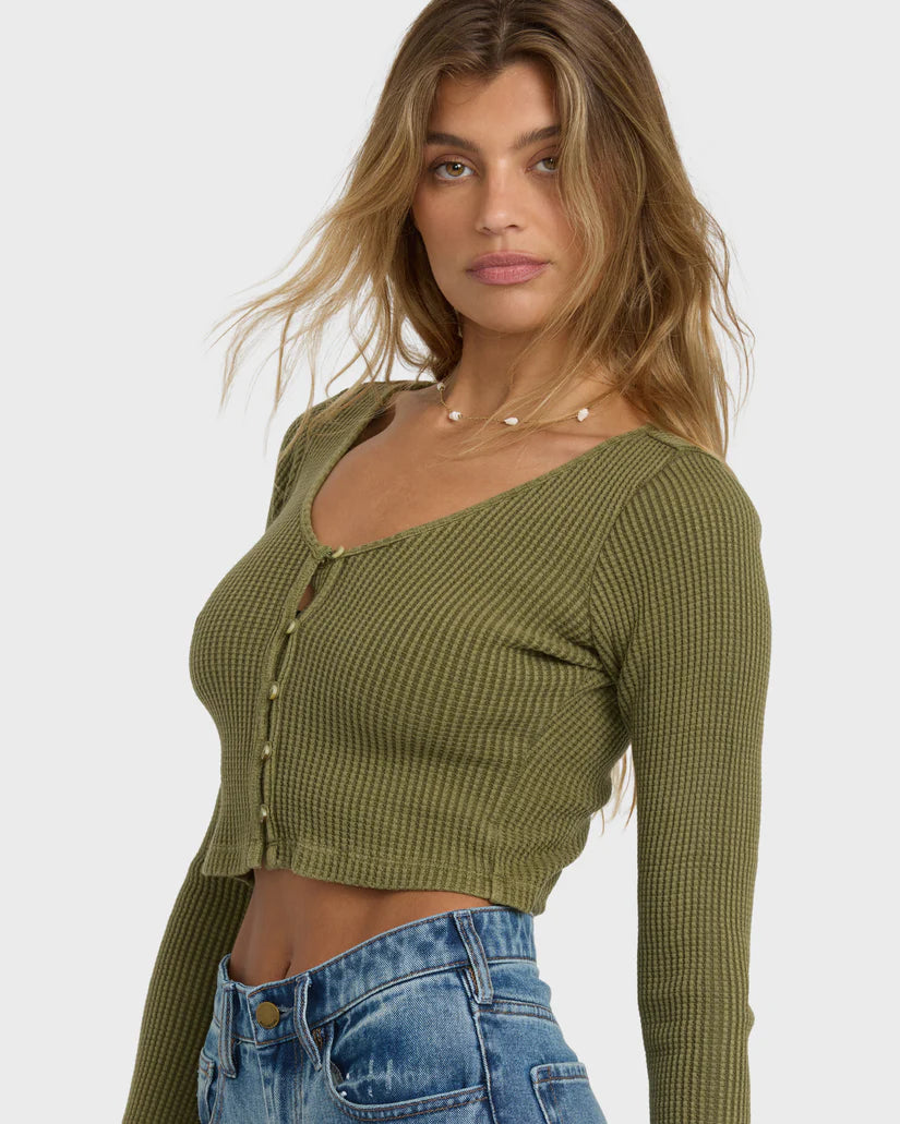 Our fitted thermal top brings cozy style with its cotton construction and V-neck button placket. The pigment dye adds lived-in appeal, while metal plate detailing gives it an extra dash of cool. Featured here in the Green colorway.