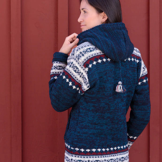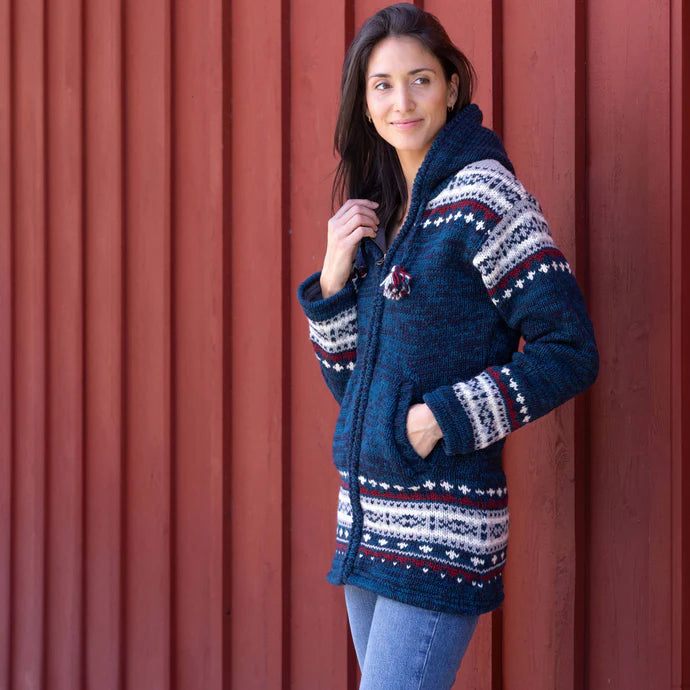 Double-strand knit and fleece-lined, the Elizabeth is oh-so cozy. A delicate jacquard pattern punctuates the sleeves, neckline and hem, while slight tonal variations in the body of the sweater emphasize the beauty of natural wool. The Elizabeth rests comfortably on the top of the thigh and is finished with ribbed slit pockets, a hood, and matching wool pompom toggles.