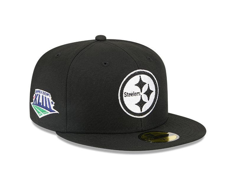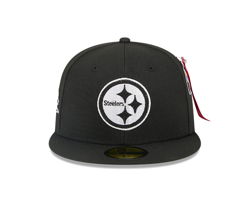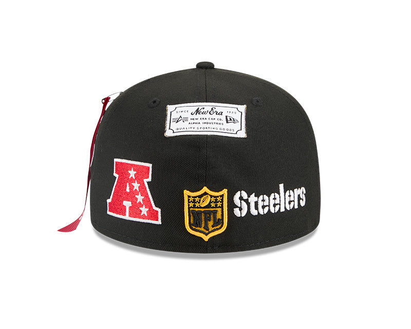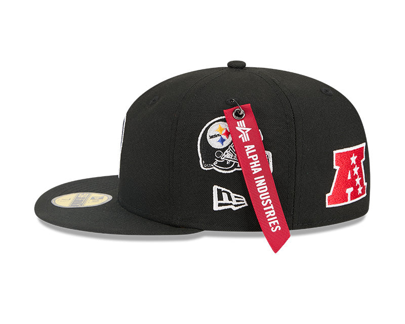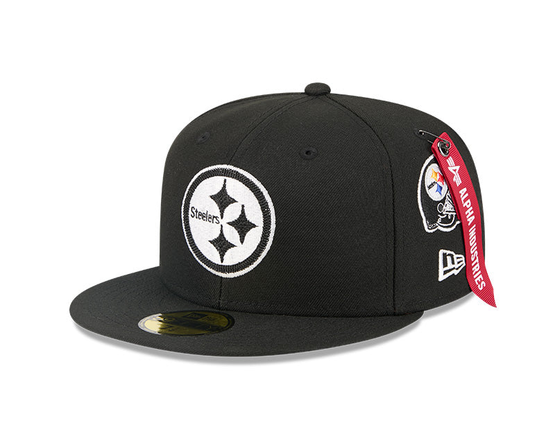 Command attention and rep your team with this Pittsburgh Steelers 59FIFTY Fitted Hat from the New Era x Alpha Industries collection. Alpha Industries is famed for its iconic military-inspired outerwear, now seamlessly merging with New Era's headwear expertise. This premium piece features a structured high crown and flat bill, offering a modern, street-savvy look. The durable polyester construction ensures long-lasting wear, while the embroidered Pittsburgh Steelers graphics with raised details pop on the sleek black backdrop for the perfect game day look.